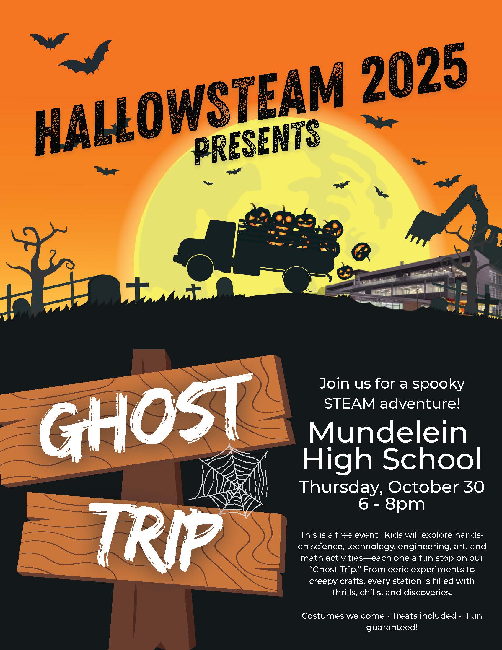 Join us for HALLOWSTEAM 2025: "Ghost Trip" at Mundelein High School on Thursday, October 30, from 6-8 PM.